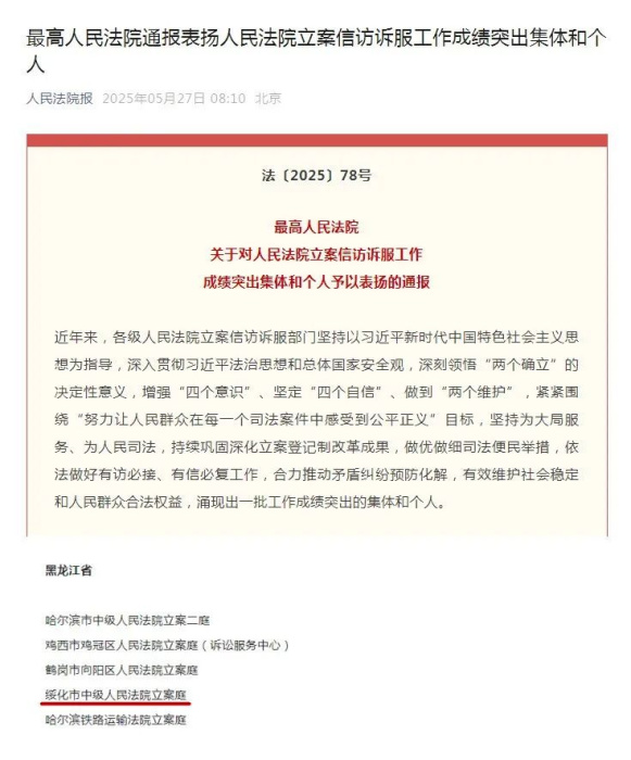为激励先进、树立榜样,进一步弘扬立案信访诉服部门干警忠诚履职、服务群众的优良作风,进一步加强新时代人民法院立案信访诉服工作,5月22日,最高人民法院发布关于对人民法院立案信访诉服工作成绩突出集体和个人予以表扬的通报,对北京市第一中级人民法院立案庭等100个集体、崔秀春等100名个人予以通报表扬。其中,绥化市中级人民法院立案庭荣获“人民法院立案信访诉服工作成绩突出集体”。
